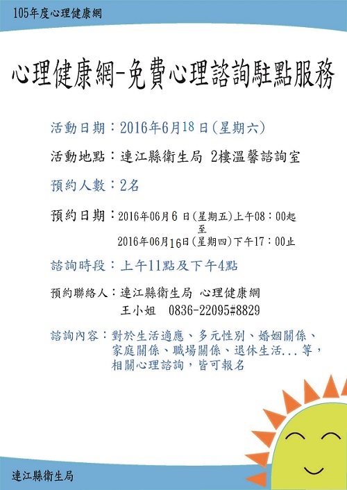 預約聯絡人:連江縣衛生局 心理健康網 王小姐 0836-22095#8829