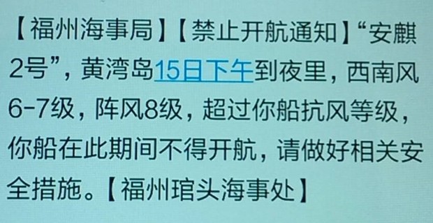 6月15日黃岐白沙航線安麒2號臨時停航公告