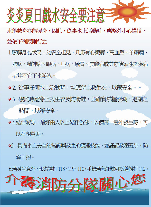 炎炎夏日介壽分隊提醒鄉親注意戲水安全 --閱讀人次 : 431 教育部體育署救溺五步防溺十招水域安全宣導短片連結https://www.facebook.com/danise.kuang