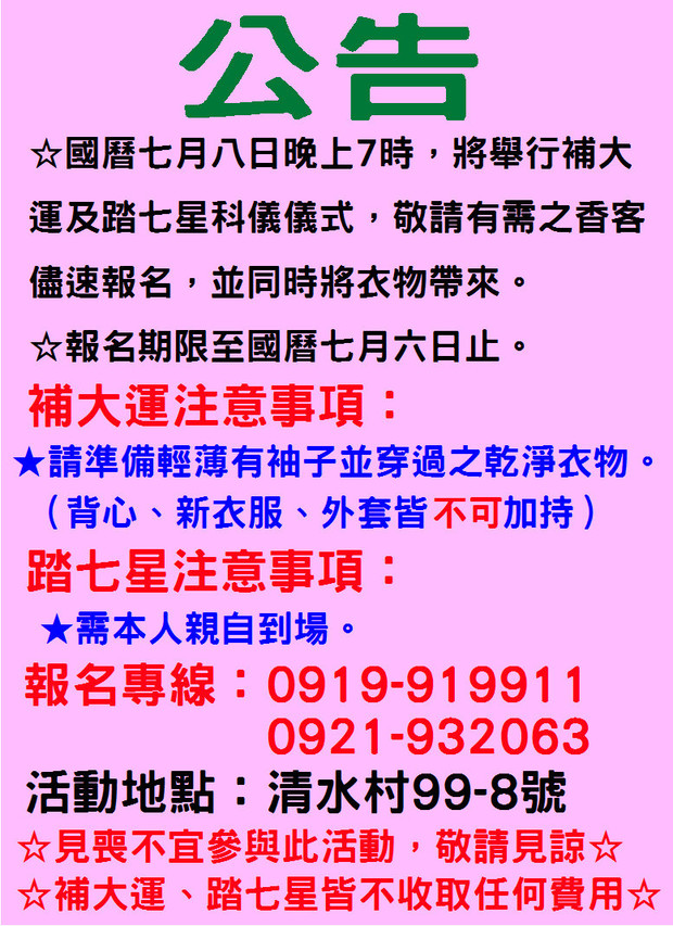 ★補大運:請準備輕薄有袖子並穿過之乾淨衣物。(背心、新衣服、外套皆不可加持)