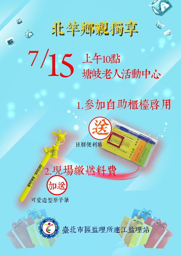 歡迎民眾踴躍參加將提供宣導品(限量100份年曆便利貼),若當日使用「監理服務自助櫃台」繳納汽燃費或違規(限本人車輛與金融卡)將再加送提供宣導品一份(限量50份)。