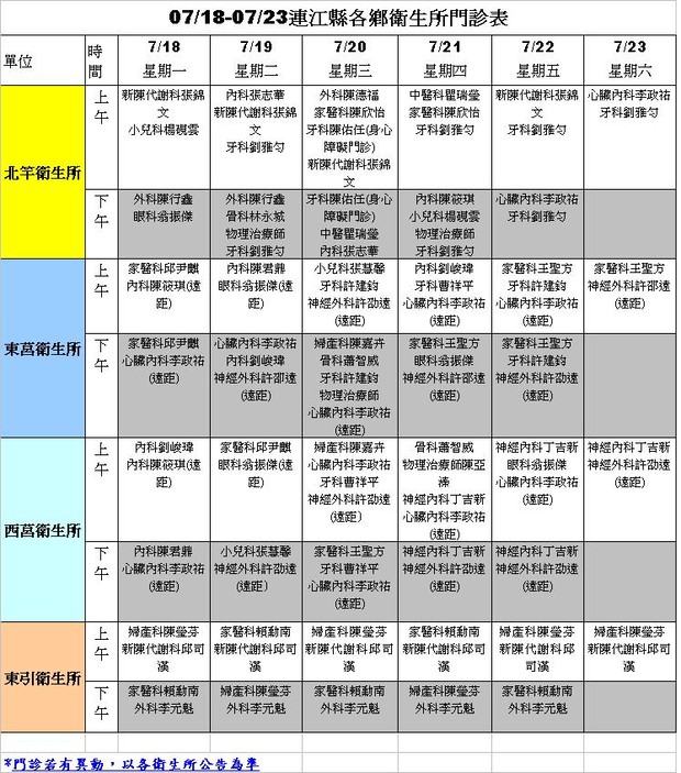 07/18-07/23各鄉衛生所門診表