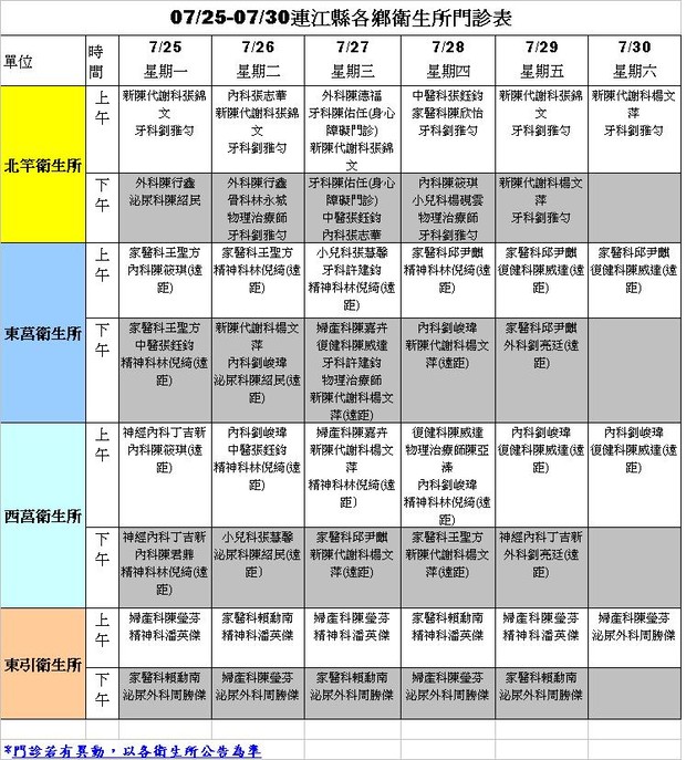 0725-0730各鄉衛生所門診表