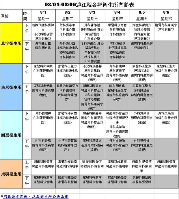 08/01-08/06各鄉衛生所門診表