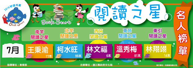 文化局7月份各島「閱讀之星」榜單公佈 --閱讀人次 : 795 來源;馬祖日報