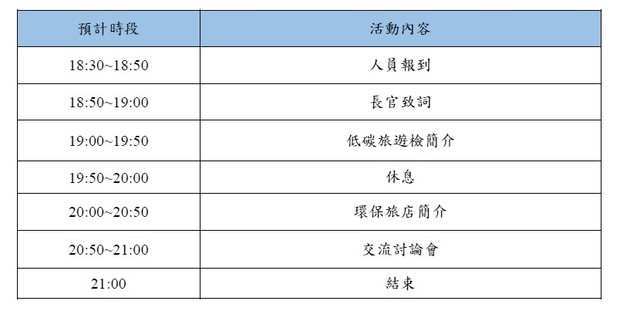 為了提倡環保的低碳旅遊,並針對旅店的食、住、行上及導遊的低碳概念,本府環保舉辦「105年度低碳旅遊推廣宣導-環保旅店宣導」,本次活動分兩梯次,第一梯次預計在105年9月12號(一)晚上18:30~21:00在南竿鄉介壽村山隴老人活動中心二樓,第二梯次預計在105年9月13號(二)晚上18:30~21:00在東引鄉鄉代表會二樓,邀請到南華大學旅遊管理學系休閒環境管理王健良教授與明新科技大學土木工程與環境資源管理系陳鴻輝博士當任講師,藉以宣導低碳旅遊及低碳旅館之環保概念及教導低碳旅遊的推動價值,讓來馬旅客減少因旅遊過程帶來的垃圾與碳排放量,對於在地的居民及商家而言,透過低碳旅遊可結合當地特色及融入在地減碳作為,促進在地民眾與遊客間互相交流,讓遊客更能融入在地文化,亦可品嘗在地飲食、活絡在地產業、提升地方特產的銷售量。活動詳情請洽長慧公司 張先生,諮詢電話:0919-702150。活動議程表如表所示。