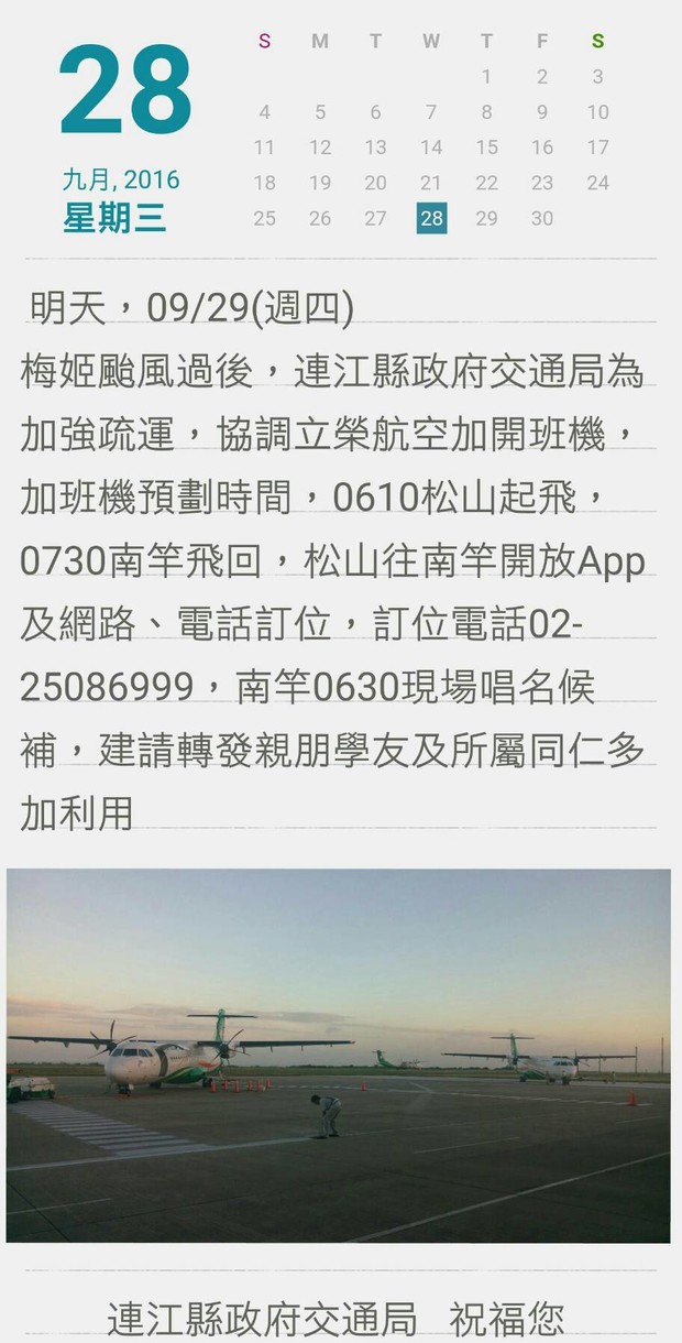 9/29加班機06:10松山起飛,07:30南竿飛回