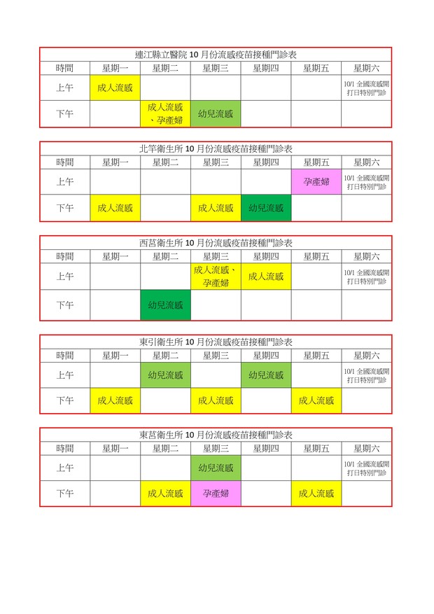 流感疫苗接種門診時刻表
