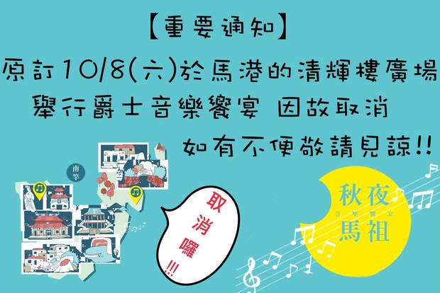 大家好,由於連日海象不佳,今天10/8在馬港清輝樓廣場的爵士音樂會取消了,之後我們會再擇日舉辦。