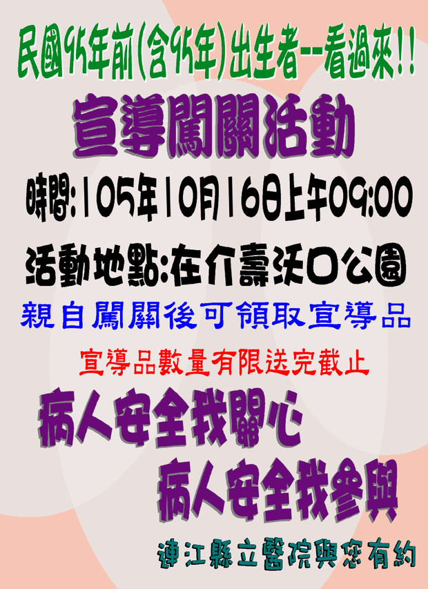 10/16病人安全宣導與健康促進闖關活動 --閱讀人次 : 706 連江縣立醫院將於10月16日(星期日)上午9點假介壽沃口公園舉辦辦理健康促進宣導活動,選定民眾最切身相關的議題進行宣導,包括「用藥安全」、「遠離三高及代謝徵候群」、「癌症篩檢」、「洗手」、「戒菸七巧」、「器官捐贈」等宣導,藉此希望能全面性的進行對社會大眾宣導促進病人安全與身心健康的知識和方法。每位參加鄉親需親自通過各關卡簽章後(一人限領一張),可領到一份參加獎(參加獎數量有限送完為止),邀請大家一起來加入守護健康的行列。