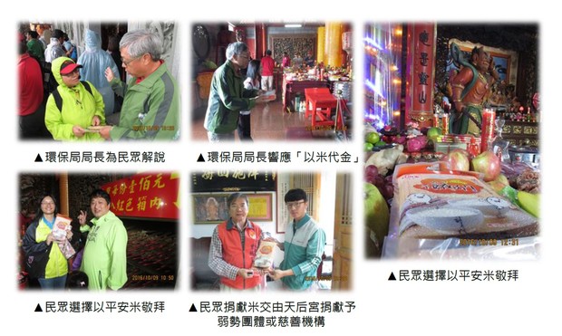 環保局局長張壽華也於媽祖昇天祭當天親臨天后宮領取平安米敬拜,一同響應「以米代金」,並於環保局服務台為民眾及信徒解說「以米代金」的好處及宣導紙錢減量效益。
