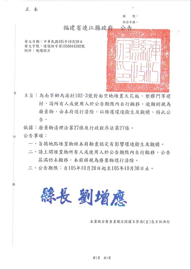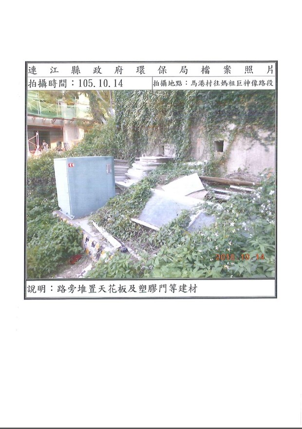 為南竿鄉馬祖村媽祖巨神像路段中段處堆置天花板、塑膠門等建材,請所有人及使用人於期限內自行搬移,逾期則視為廢棄物,由本府逕行清除,以維護環境衛生及觀瞻。