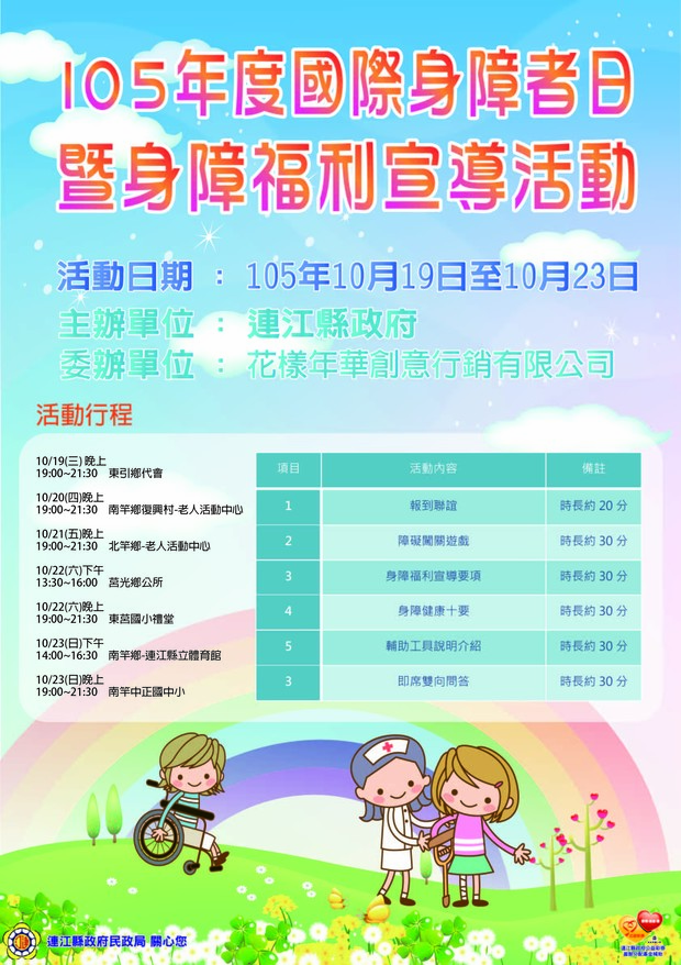 105年連江縣政府福利宣導10/22活動預告 --閱讀人次 : 652 今日10/21 晚間19:00-21:30於