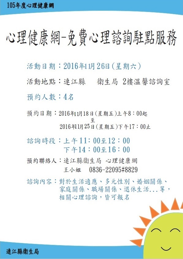 預約聯絡人:連江縣衛生局 心理健康網 王小姐 0836-22095#8829