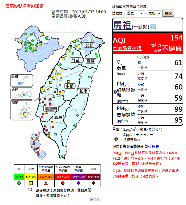 環保署提醒馬祖、金門及中部地區敏感族群注意,雲嘉南及高屏地區所有族群應減少在戶外活動。