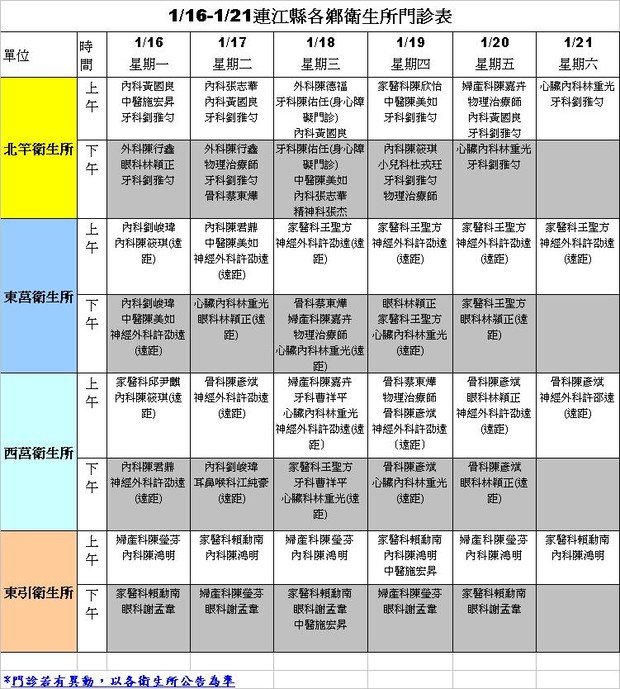 01/16-01/21各鄉衛生所門診表