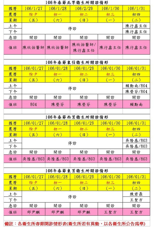 春節期間各衛生所開診情形