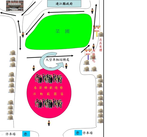 1月28日活動當天上午7時起至12時止,由良健機車行前道路進入介壽廣場車輛,均實施單向管制,凡駛入介壽廣場車輛(除大型迎賓車及公共汽車外)均指揮其行經縣政府前道路,繞行蔬菜公園行駛。