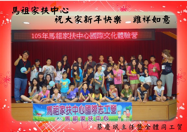 馬祖家扶中心祝福大家新年快樂 --閱讀人次 : 522 感謝鄉親一年來對馬祖家扶支持與協助,馬祖家扶中心將帶著大家的期待,在新的一年裡持續為在地的兒少服務,在此祝福大家新年快樂、雞祥如意。