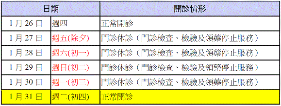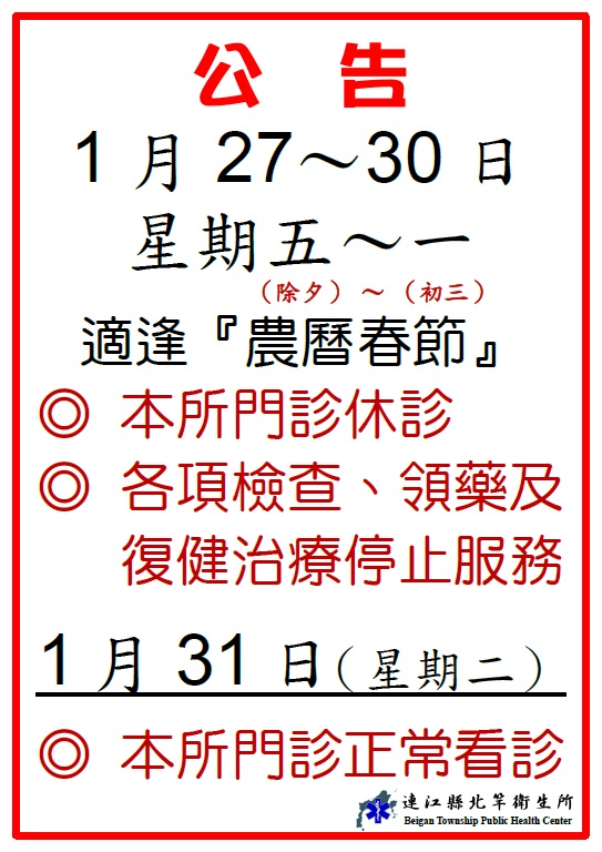 北竿衛生所門診於1月27~30日(週五~週一)休診,各項檢查、領藥及復健治療停止服務,