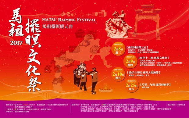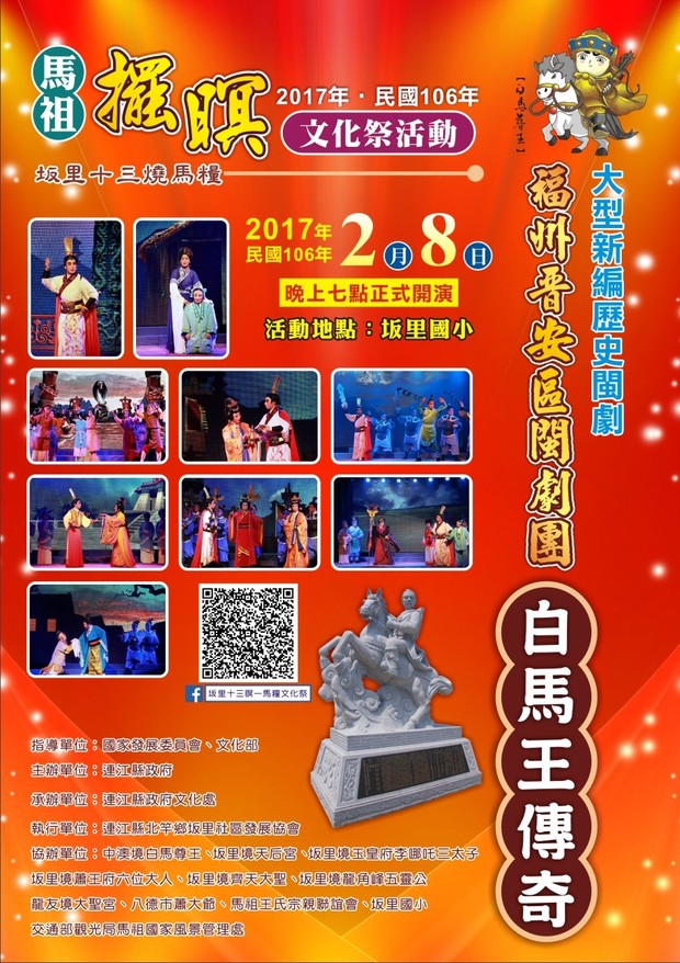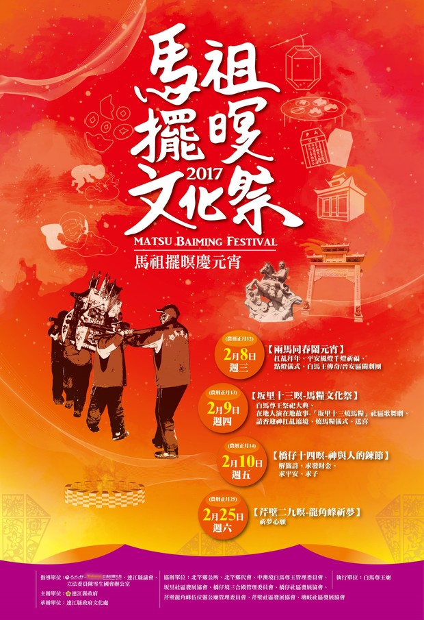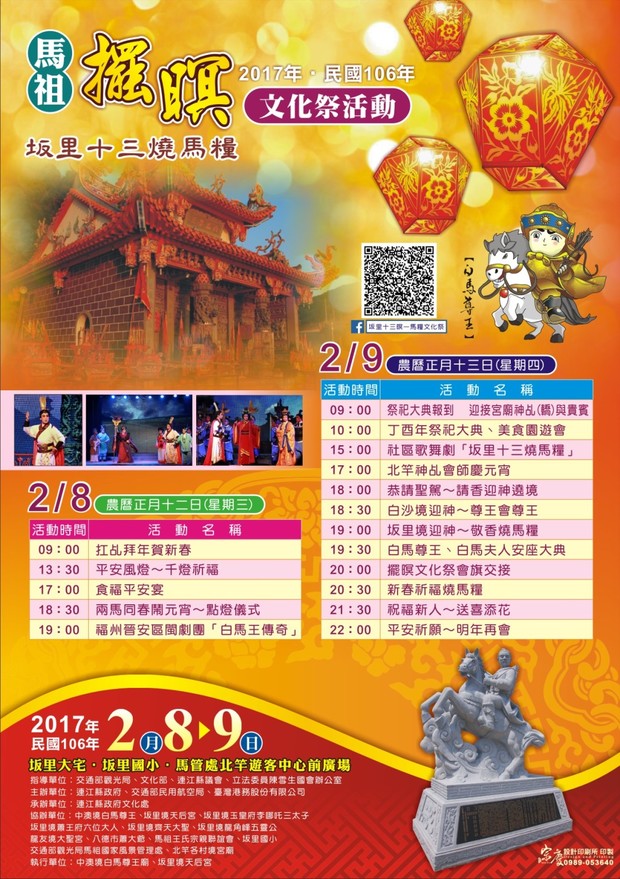 ▲9日(正月十三)馬糧文化祭:上午10:00板里燒馬糧文化祭祭祀大典、下午15:00社區歌舞劇十三暝燒馬糧、下午17:00北竿神乩會師慶元宵、晚間18:00迎神遶境、晚間18:30尊王會尊王(白沙村境)、晚間19:00板里境迎神、晚間19:30白馬王、白馬王夫人安座大典、20:00擺暝文化祭會旗交接、晚間20:30新春祈福燒馬糧、晚間21:30祝福新人送喜添花(板里)