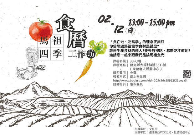 馬祖四季食曆工作坊-東莒場 --閱讀人次 : 567 縣府文化局社造中心主辦「馬祖四季食曆工作坊」活動2月12日(日) 下午1300登場,延續去年度馬祖食尚主題,將自種風潮所關注的美味、無毒、產地到餐桌的概念擴展到漁業,邀請社區夥伴以及關心農民與關心環境的團體及業者一同來製作馬祖四季食曆,由社區角度進行串連在地生產者,一同推廣無毒友善食材,喚起大眾對於土地、食材的關懷。
