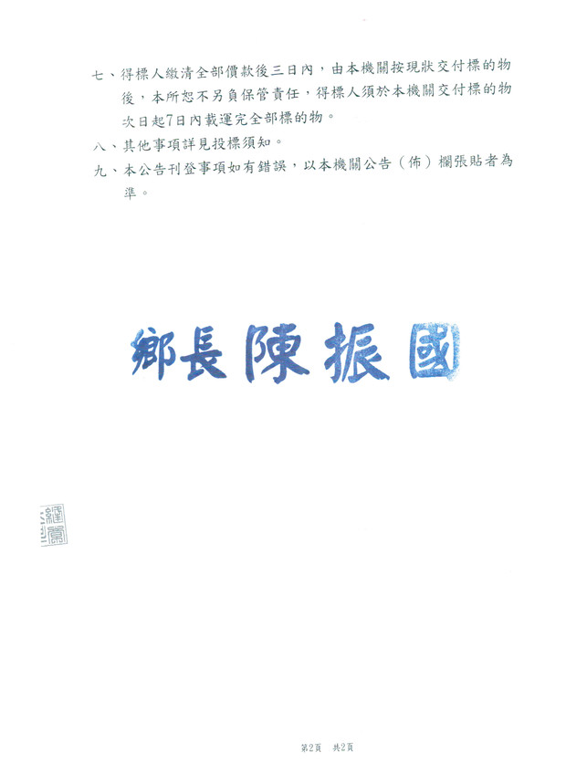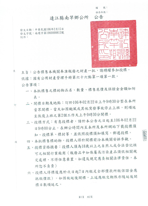 連江縣南竿鄉公所公告標售報廢財產一批 --閱讀人次 : 842