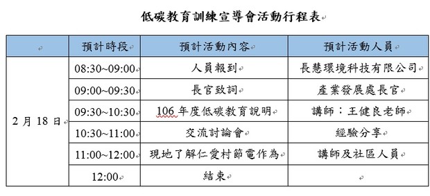 有鑑於此,本府產業發展處為讓鄉親了解氣候變遷及節能減碳的重要性,特地於南竿鄉仁愛村多功能活動中心舉辦「低碳教育訓練宣導會」,本次活動特地邀請知名的節能博士 王健良老師蒞臨指導,教導大家節電的方法,此外,也會至仁愛村觀摩節能減碳措施,實際了解對於低碳家園可以實施的作法,本次活動結束後提供民眾領取餐盒,並提供環境教育時數,教導對環境的氣候變遷及節能減碳等議題,歡迎各機關踴躍參加。