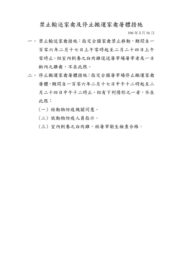 本縣境內家禽屠宰場於106年2月17日中午12時起