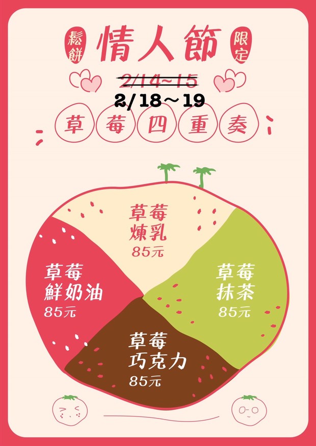 原訂的情人節限定,因為廠商沒出貨,順延至2/18、19特賣,喜歡的朋友千萬別錯過了最後一波的草莓鬆餅!