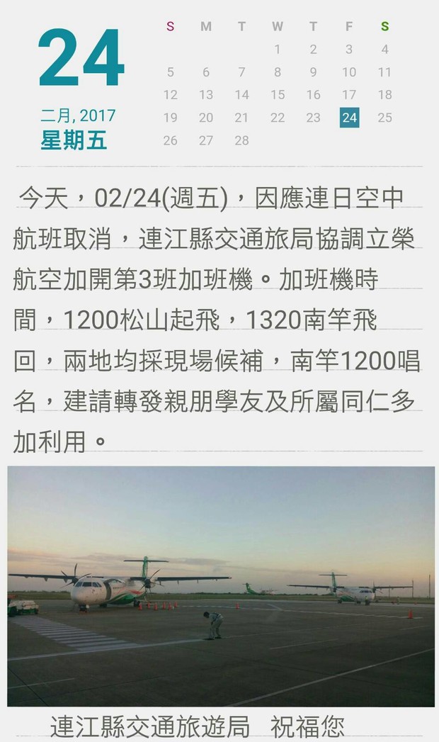 今天(2/24)第3班加班機 12:00松山起飛 13:20南竿飛回 開放補位