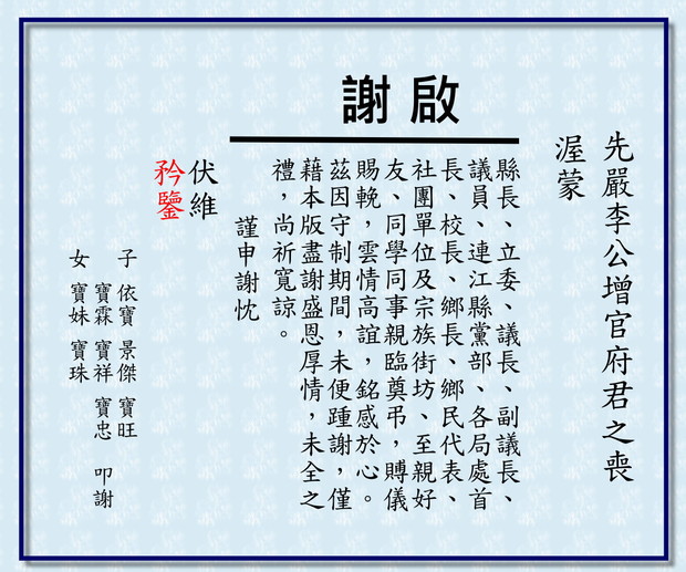 先嚴李公增官府君之喪謝啟