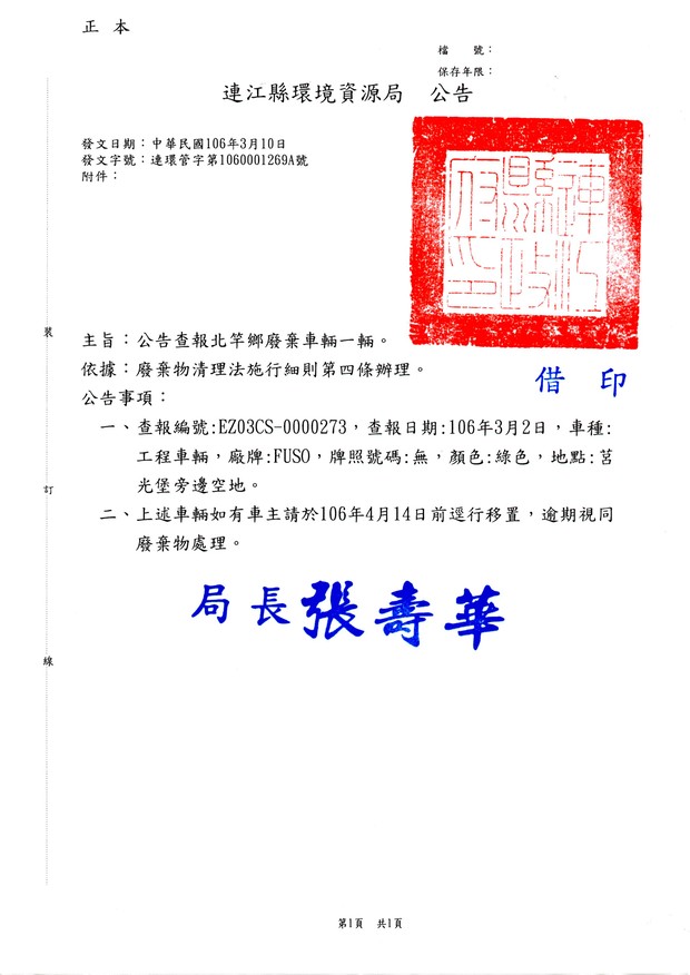 公告查報北竿鄉廢棄車輛1批