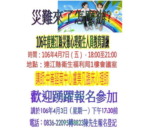 106年度連江縣災難心理衛生教育訓練 --閱讀人次 : 724 1999年九二一地震、2009年莫拉克風災,分別造成了2419人與702人死亡,而最近的2014年復興航空GE222班機空難、高雄氣爆事件,2015年復興航空GE235班機空難與八仙樂園粉塵爆炸,以及2016年的高雄美濃地震,均造成大量傷亡。災害除了為人民生命與財產帶來重大損失外,亦會造成人心的恐慌和不安,甚至可能產生內心不可抹滅的創傷。為持續增進連江地區衛生醫療與社區網絡(如民政與軍政)人員對於危機事件(災難、意外造成之傷亡)處遇概念,瞭解災難或意外事件之危機介入知能及實務技巧,並瞭解安心服務在災難心理衛生之工作原則及流程,特規劃此次教育訓練