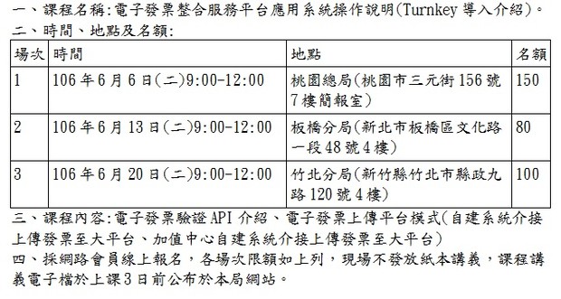財政部北區國稅局將於106年6月6日、6月13日及6月20日辦理電子發票整合服務平台應用系統操作說明(Turnkey導入介紹),請有意願導入電子發票且對Turnkey軟體有興趣之營業人自行於本局網站報名參加。