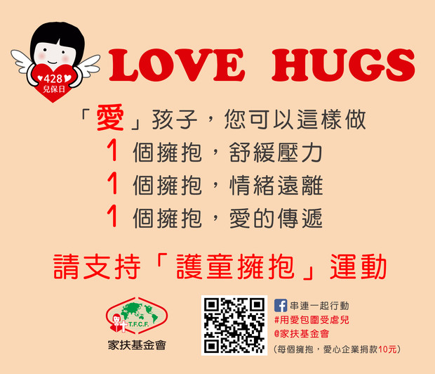 即日起至4/28止,每募集1個溫暖擁抱,愛心企業將捐助10元支持家扶兒童保護工作!透過全國串連的力量,募集10,000個擁抱,請您一起來幫助受虐兒少修復傷痛〜