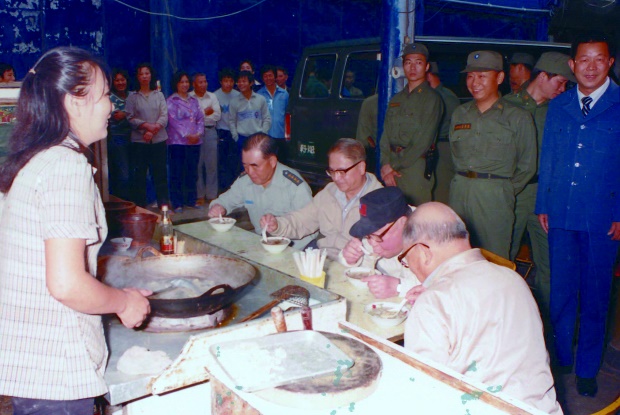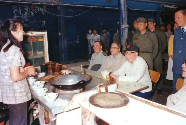民國74年6月13日,蔣經國總統與參謀總長郝柏村(左一)、行政院副院長林洋港(左二)、國安會秘書長汪道淵(右一)在福澳福香小吃店品嘗餛飩。