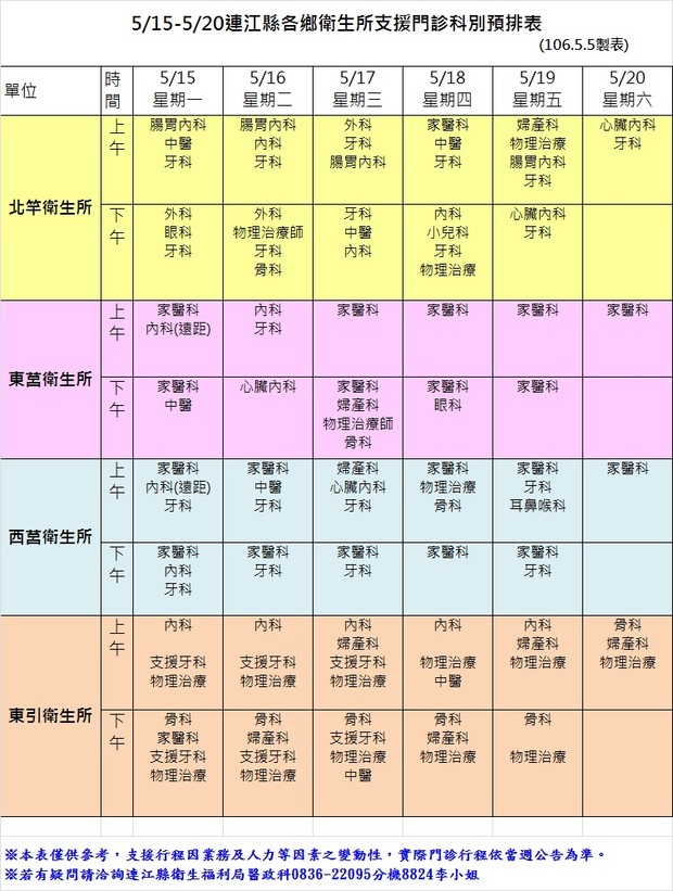 05/15-05/20各鄉衛生所支援科別門診預排表