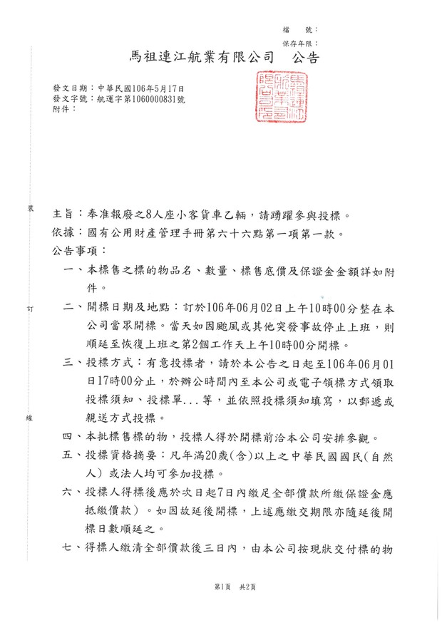 連江航業─標售8人座小客貨車乙輛 --閱讀人次 : 1262