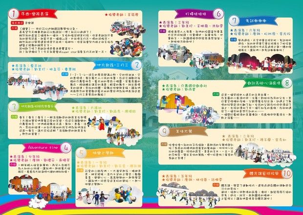 晚間的藝文展演,內容包含樂隊表演、地方歌謠、學區鼓板、青春熱舞、校歌合唱,及校內各個年級一整日完整既充實的生活作息;演出學生包括幼兒園、國小及國中三大階段,風格貫穿中西,總共推出13個精彩節目。