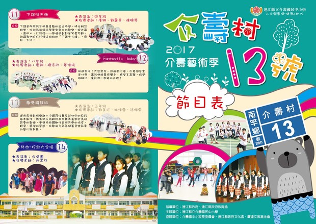 為深耕藝文活力,呈現多元風采,兩年一度的介壽藝術季今晚在介壽堂盛大展開。今年的介壽藝術季主軸為「介壽村13號」,就是學校所在的地址,意謂著歡迎大家走進校園,共同參與教育,關懷孩子的學習與成長。