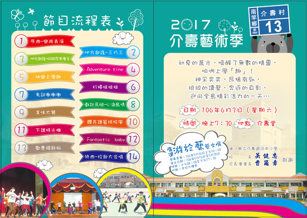 介壽國中小藝術季動態展演6月3日晚間7時30分在介壽堂熱情登場,校方與家長會誠摯邀請各界鄉親踴躍前往指導及觀賞。