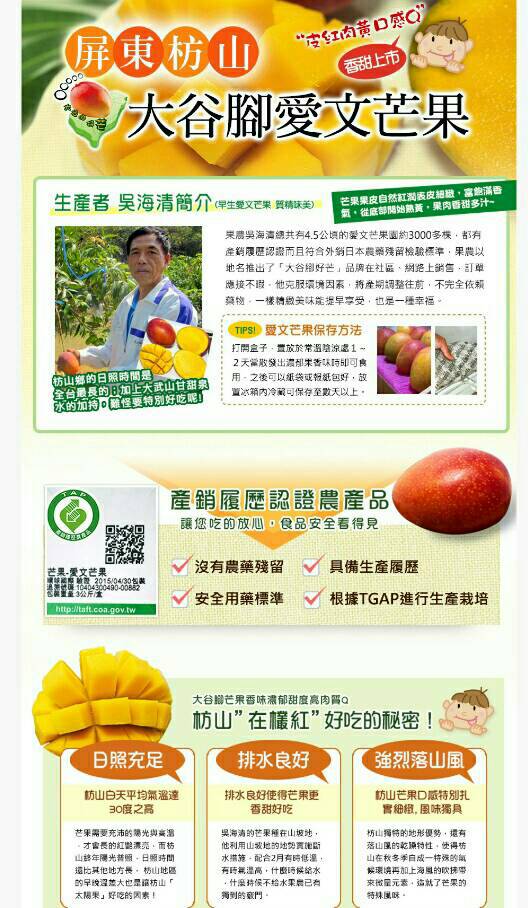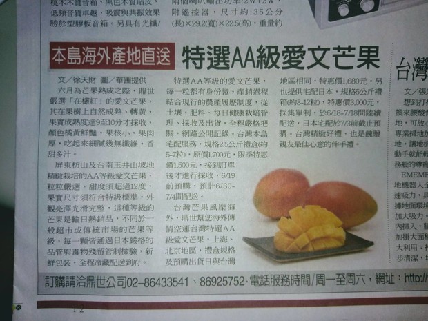 是的,芒果漲價了,再不買還可能再漲,為了不讓上次向隅的朋友太心痛,附上一張今日(106/6/2)聯合報C3版報導,一模一樣的芒果,市價2.5公斤賣1500-1700元,我們的在叢紅5台斤(約3公斤)只賣800-900元,幾乎是外銷價的對折,所以......,別再猶豫了啦!這個芒果品質真的好吃到會為果農按個讚。