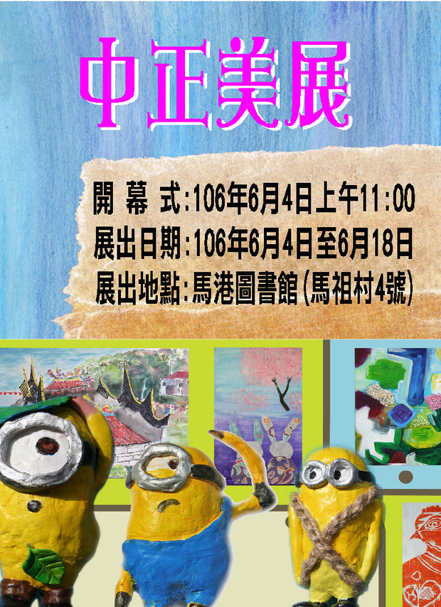 中正美展6/14-6/18歡迎您 --閱讀人次 : 697 中正一年一度的藝術人文成果發表會今年突破以往只有六月音符動態演出,今年別開生面增加了中正美展的靜態展覽,讓學生擁有動靜皆宜多元能力展現舞台,明天6月4日上午11點中正美展將在馬港圖書館舉行開幕式,學生一整年的作品呈現在大家眼前,我們也安排學生導覽,所有的美好,期待您的蒞臨鼓勵,歡迎大家明早11點來馬港圖書館享受美學饗宴,晚上7點30分來學校大禮堂欣賞西遊記六月音符精彩演出,最後感謝文化處場地及佈展期間的協助