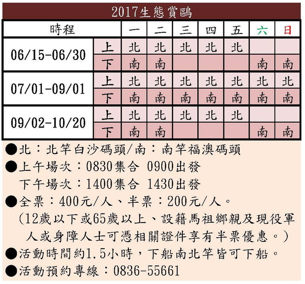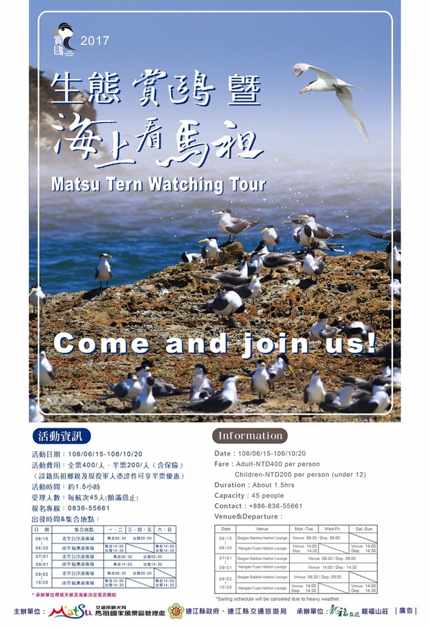 出海賞鷗活動,活動為期自6月15日至10月20日,南竿北竿均有出發,