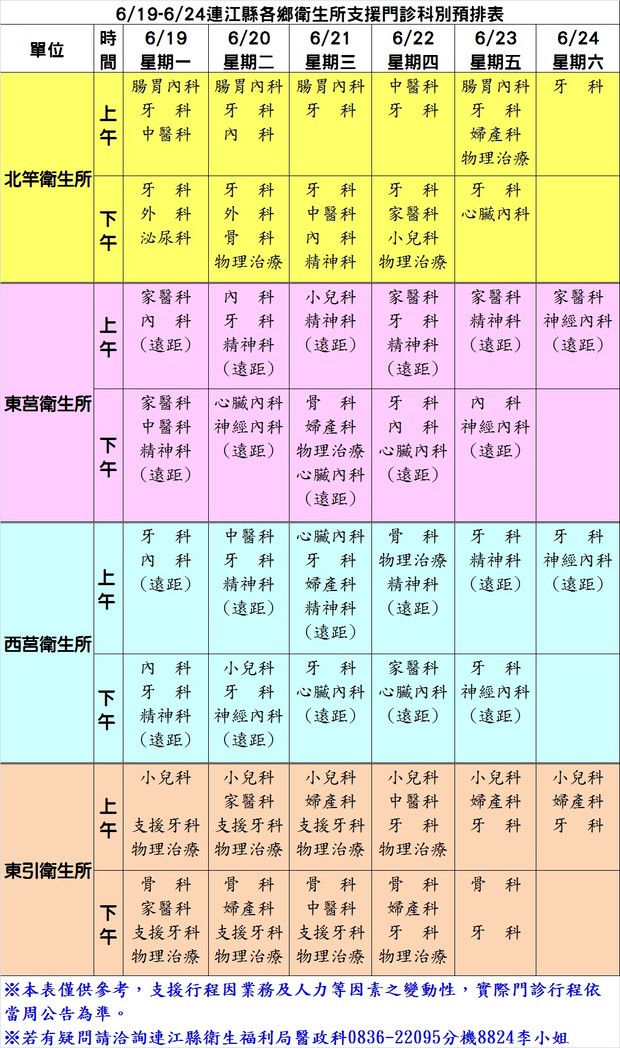 06/19-06/24各鄉衛生所支援門診科別預排表
