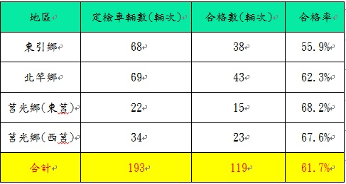 連江縣環境資源局離島地區機車排氣檢測 --閱讀人次 : 769 由於本縣合格的2家民間機車定檢站集中於南竿鄉,對於離島地區推動機車定檢服務,環資局為便利民眾,每季派員巡迴各鄉,提供免費檢測服務,本季離島地區移動式機車排氣檢測數共計193輛,合格率為61.7%,如下表所示,本局藉由每季不定期移動式定檢站機動性的服務,提昇本縣機車到檢率,同時也希望民眾能經常留意自己愛車的排氣狀況,確實完成定期機車排氣檢測,共同維護本縣空氣品質。