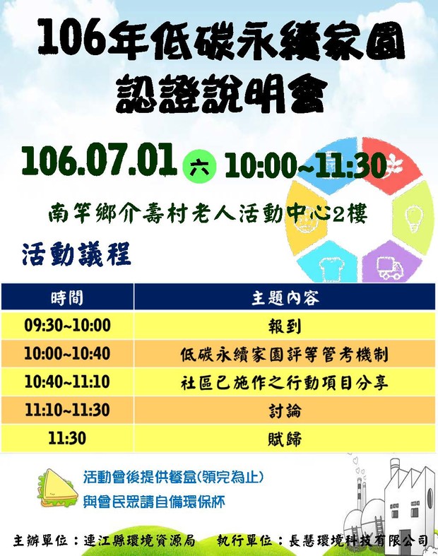 連江縣環境資源局近幾年持續推動低碳永續家園,以推廣公共區域節電、低碳社區營造概念、太陽能電熱水器或光電系統及電動車等,共同構建連江縣低碳生活社區。故辦理此場說明會,特邀請相關專長之學者介紹目前環保署推動低碳永續家園及認證評等機制外,亦向民眾介紹目前連江縣各社區已進行之低碳做法,期許透過此次說明會使在地民眾、各社區代表了解何謂低碳永續家園、如何於日常生活中落實各項低碳行動項目、該如何精進持續進行中之低碳行為。