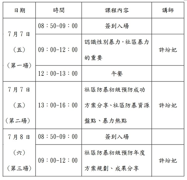 目 的:為加強推廣「暴力零容忍」之社區意識,推動反暴力社區宣導活動,爰辦理此次培力研習,建立橫向連結共同合作營造反暴力的社區意識。