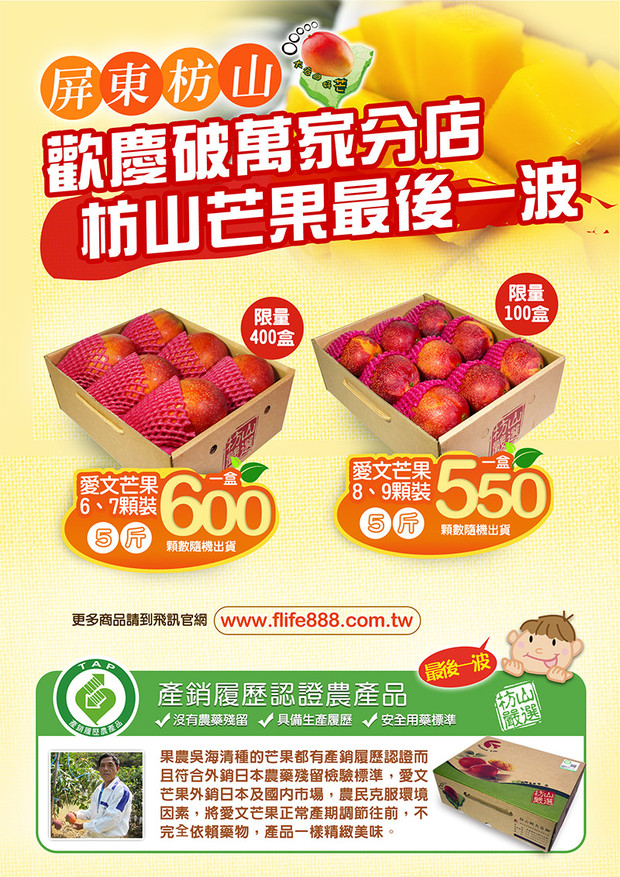 特報 特報 --閱讀人次 : 969 感謝支持,試營運首波主打屏東枋山外銷的愛文芒果(在欉黃),受到熱烈好評,果香濃郁,口感滑順,Q彈多汁。
